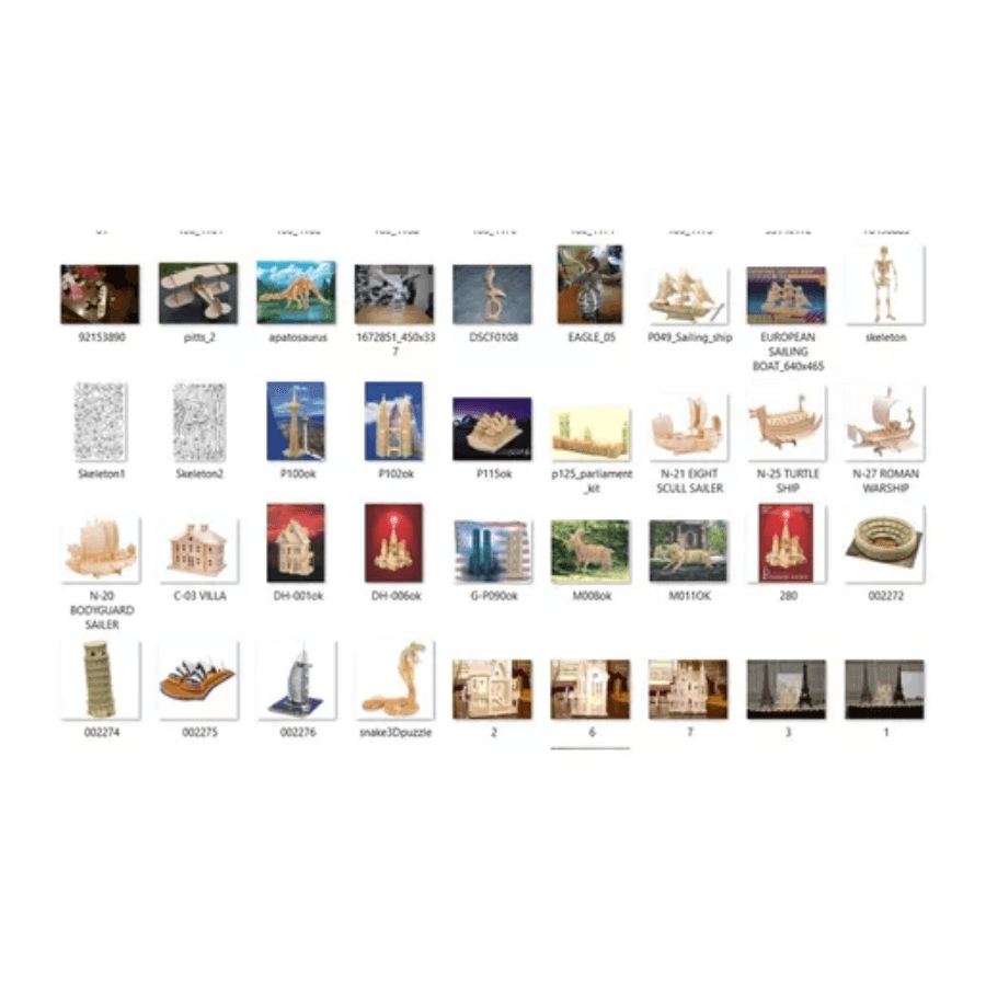 Rompecabezas 3D, Árboles de arquitectura, Adornos, Cajas de vino, Cajas de dulces, Letras, Personajes de TV, Animales, Juguetes, Mariposas, Hadas, Cajas, Dinosaurios, Casas de muñecas, Muebles, Bandejas, Mandalas, Diseños de lámparas, Accesorios de decoración del hogar, Navidad, Halloween, Barra de chocolate y nuevos diseños exclusivos premium.