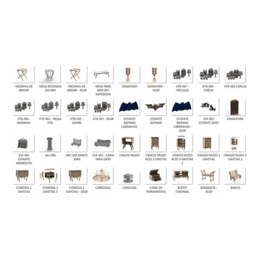 Muchos vectores de cajas, estantes, relojes de pared, juguetes, cuadros y marcos, marcos de fotos, la Torre Eiffel 3D, kits para fiestas, souvenirs, llaveros, mesas y sillas, escaleras, miniaturas de juguete, pendientes, muchos utensilios para el hogar y el trabajo, y muchos artículos geniales. En fin, tengo más de 50,000 diseños diferentes para poner a tu disposición...
